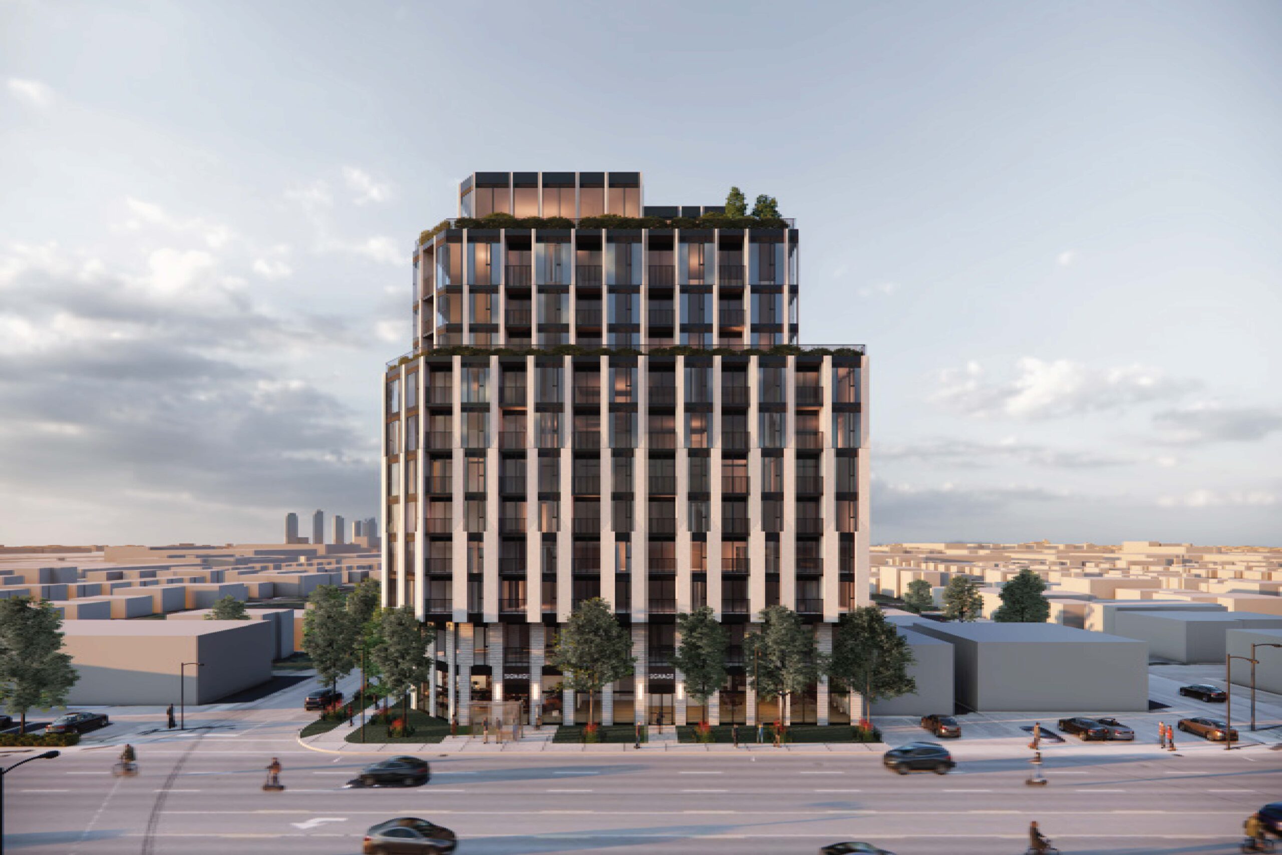 A former Bank of Montreal branch, this site is being redeveloped into an 11-storey mixed-use building. The building will feature 180 purpose-built rental apartments and ~2,700 square feet of ground-floor retail. Designed by Turner Fleischer, the project’s unit mix (50%+ 2- and 3-bedroom layouts) caters to families and downsizers. A streetfront retail corner at Culnan Ave. & The Queensway adds everyday convenience for residents and the community.